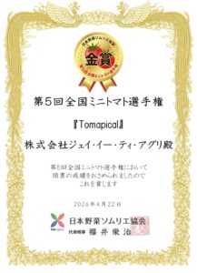 2026年4月22日に開催された一般社団法人日本野菜ソムリエ協会主催の「第5回全国ミニトマト選手権」にて、当社子会社であるジェイ・イー・ティ・アグリの【Tomapical】が金賞を受賞しました。